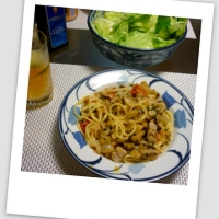 これらに、ナス、ニンニク、豚バラの塩漬けを炒めパスタにしました。